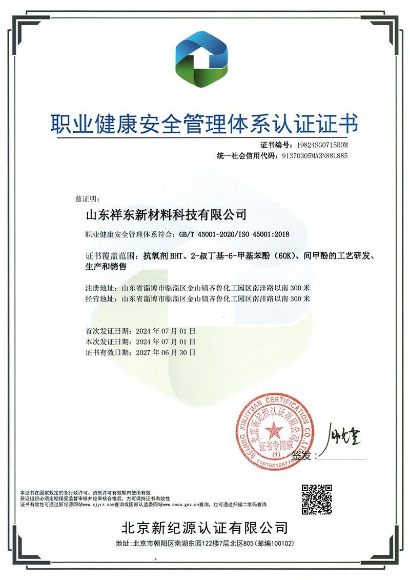 山東祥東新材料科技有限公司1.2萬噸/年6-叔丁基鄰甲(60K)、4-叔丁基鄰甲酚(偏 24 酚)和 4,6-二叔丁基鄰甲酚(偏 246 酚)烷基甲酚項目竣工環境保護驗收監測報告